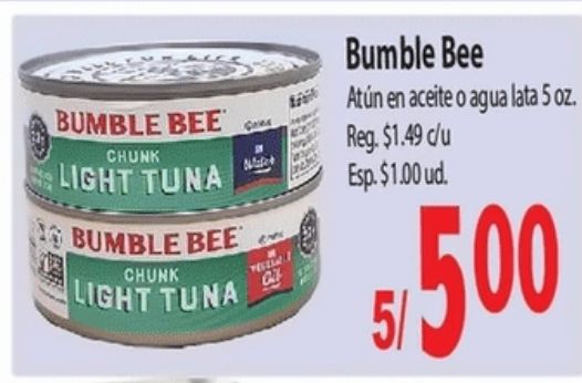 bumble chunk light tuna gene atĂșn aceite agua lata reg. $c/u esp. $ud.