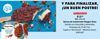 Barras de mantecado haagen-dazs vainilla con chocolate y almendras. Empaque de 15 de 3 oz. Sujeto a raincheck.