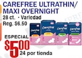 carefree ultrathin/ maxi overnight varledad reg. $carefree especial $por tienda