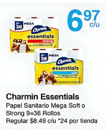 charmin essentials strong papel sanitario mega soft rollos regular $c/u *por tienda