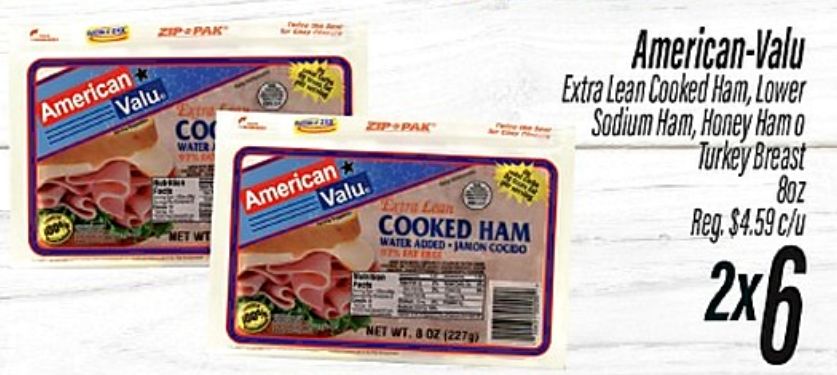 american valu zip=pak extra water zip+pak american-valu lean cooked lower sodium ham, honey turkey breast added janon cocido reg. $c/u