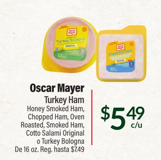 Oscar Mayer Turkey Ham Honey Smoked Ham, Chopped Ham, Oven Roasted, Smoked Ham, Cotto Salami Original o Turkey Bologna De 16 oz.