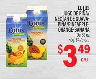LOTUS JUGO DE PIÑA/ NECTAR DE GUAVA-PIÑA/ PINEAPPLE- ORANGE-BANANA De 58 oz.