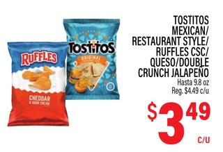 TOSTITOS MEXICAN/RESTAURANT STYLE/RUFFLES CSC/QUESO/DOUBLE CRUNCH JALAPEÎΟ Hasta 9.8 oz