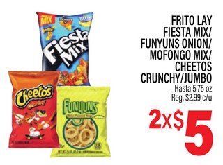 FRITO LAY FIESTA MIX/FUNYUNS ONION/MOFONGO MIX/ CHEETOS CRUNCHY/JUMBO Hasta 5.75 oz