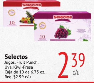 Selectos jugos. fruit punch, uva, kiwi-fresa caja de 10 de 6.75 oz.