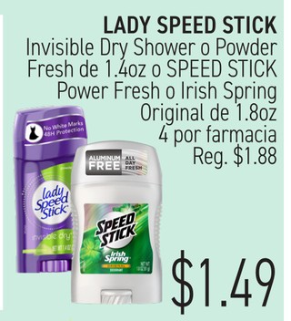 LADY SPEED STICK Invisible Dry Shower o Powder Fresh de 1.4oz o SPEED STICK Power Fresh o Irish Spring Original de 1.8oz 4 por farmacia