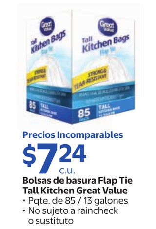 Bolsas de basura Flap Tie Tall Kitchen Great Value Pqte. de 85/13 galones No sujeto a raincheck o sustituto