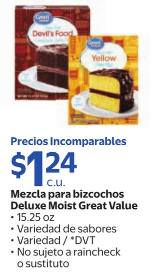 Mezcla para bizcochos Deluxe Moist Great Value 15.25 oz Variedad de sabores Variedad / *DVT No sujeto a raincheck o sustituto