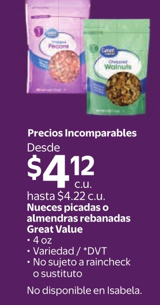 Nueces picadas o almendras rebanadas Great Value 4 oz Variedad / *DVT No sujeto a raincheck o sustituto No disponible en Isabela.