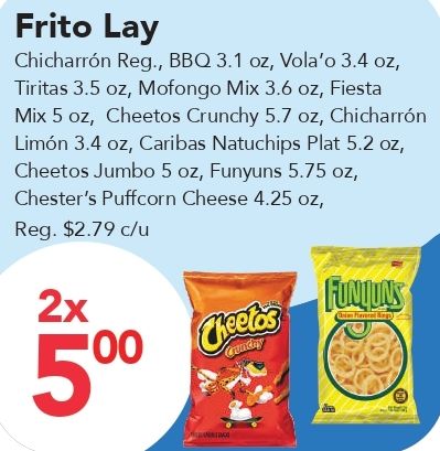frito chicharrón vola'o tiritas mofongo fiesta cheetos crunchy limón caribas natuchips plat jumbo funyuns chester's puffcorn cheese reg. $c/u 'cheetos funions country