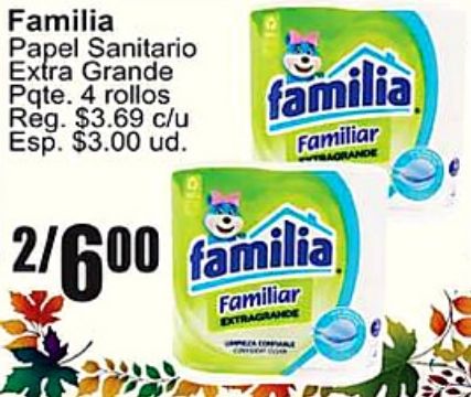 familia papel sanitario extra grande pqte rollos reg. $c/u esp. $ud. familiar /familia extragrande agrande