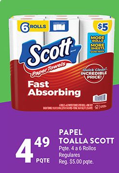 ⑥rolls scott paper towels fast absorbing $ore rolls more sheets quick clean incredible price! papel toalla pqte rollos regulares reg. $pqte.