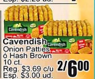 cavendish onion patties hash brown reg. $c/u esp. $ud.