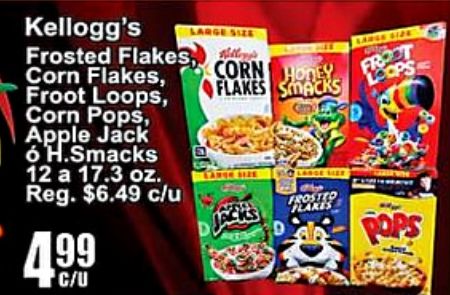 kellogg's frosted flakes corn froot loops, pops, apple jack hsmacks reg. $c/u large size honey smacks pops