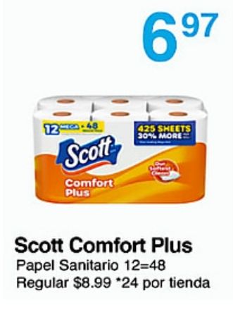scott comfort plus sheets more papel sanitario =regular $*por tienda