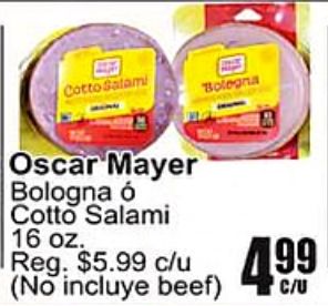cotto salami bologna oscar mayer reg. $c/u(no incluye beef)