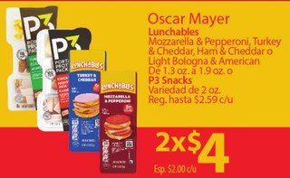 Oscar Mayer Lunchables Mozzarella & Pepperoni, Turkey & Cheddar, Ham & Cheddar o Light Bologna & American De 1.3 oz. a 1.9 oz.o P3 Snacks Variedad de 2 oz.