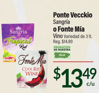 Ponte vecckio sangria o fonte mia vino variedad de 3 lt.