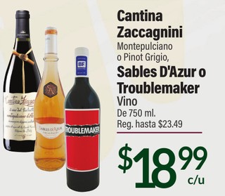 Cantina Zaccagnini Montepulciano o Pinot Grigio, Sables D'Azur o Troublemaker Vino De 750 ml.
