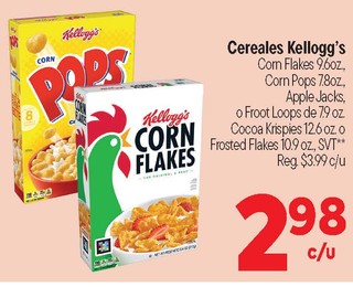 Cereales kellogg´s corn flakes 9.6 oz., corn pops 7.8 oz., apple jacks, o froot loops de 7.9 oz. cocoa krispies 12.6 oz. o frosted flakes 10.9 oz., svt **
