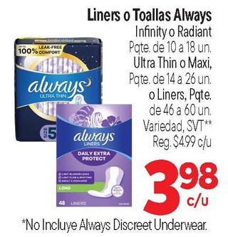 Liners o Toallas Always Infinity o Radiant Pqte. de 10 a 18 un. Ultra Thin o Maxi, Pqte. de 14 a 26 un. o Liners, Pqte. de 46 a 60 un. Variedad,