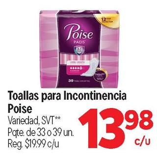 Toallas para Incontinencia Poise Variedad, Pqte. de 33 o 39 un.