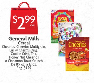 General Mills Cereal Cheerios, Cheerios Multigrain, Lucky Charms Orig., Cookies Crisp, Trix, Honey Nut Cheerios