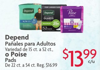 Depend Pañales para Adultos Variedad de 15 ct. a 52 ct., o Poise Pads De 22 ct. 5 ct.