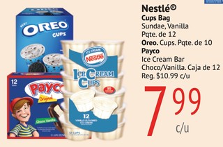 Nestle Cups Bag Sundae, Vanilla Pqte. de 12 Oreo. Cups. Pqte. de 10 Payco Ice Cream Bar Choco/Vanilla Caja de 12