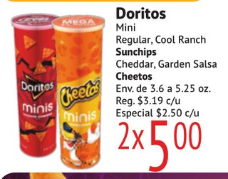 Doritos Mini Regular, Cool Ranch Sunchips Cheddar, Garden Salsa Cheetos Env. de 3.6 a 5.25 oz.