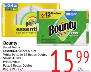 Bounty Papel Toalla Essentials. Select-A-Size White Pqte. de 12 Rollos Dobles Select-A-Size Prints, White Pqte. 6 Rollos Dobles