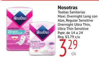 Nosotras Toallas Sanitarias Maxi. Overnight Long con Alas, Regular Sensitive Overnight Ultra Thin, Ultra Thin Sensitive Pqte. de 14 a 24