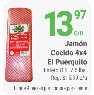 Jamón Cocido 4x4 El Puerquito Entero U.S. 7.5 lbs.