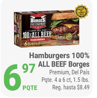 Hamburgers 100% 17 ALL BEEF Borges Premium, Del PaÃs Pqte. 4 a 6 ct, 1.5 lbs.