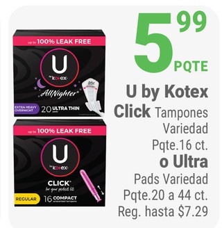 U by Kotex Click Tampones Variedad Pqte. 16 ct. Pads Variedad Pqte.20 a 44 ct. Reg. hasta $7.29 o Ultra