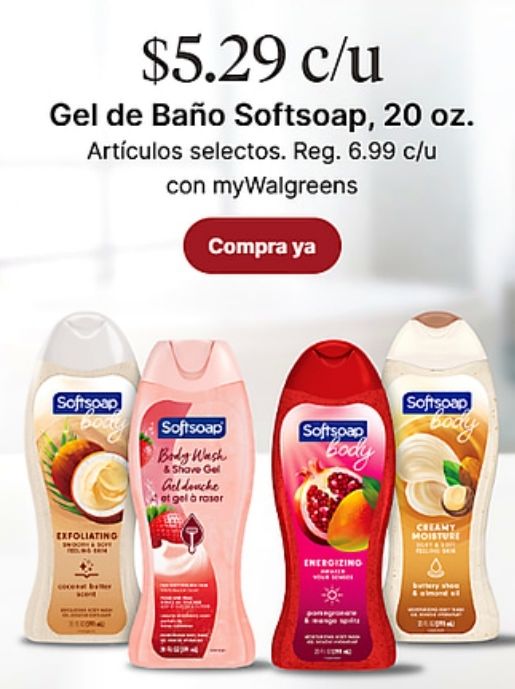 $c/u baño softsoap artículos selectos. reg. mywalgreens compra softspap body wash shave douche raser exfoliating energizing creamy moisture