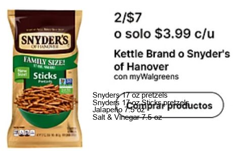 snyder's handser family size! sticks $c/u kettle brand hanover mywalgreens snyders pretzels pretz jalapeƱo soductos salt vinegar