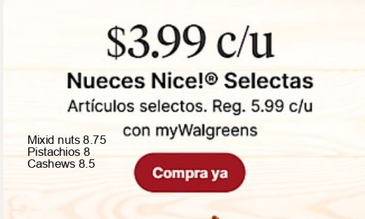 $c/u nueces nice!® selectas artículos selectos reg. mixid nuts pistachios cashews mywalgreens compra