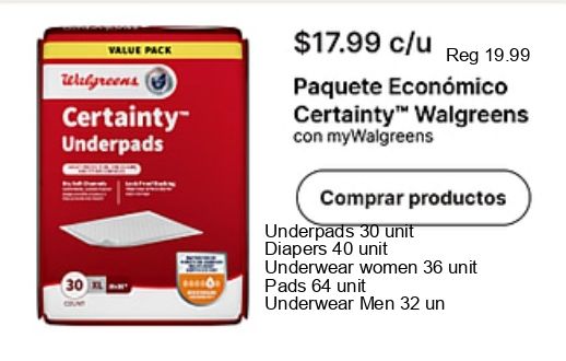 value pack walgreens certainty- underpads $c/u paquete económico certainty mywalgreens comprar productos unit diapers underwear women pads