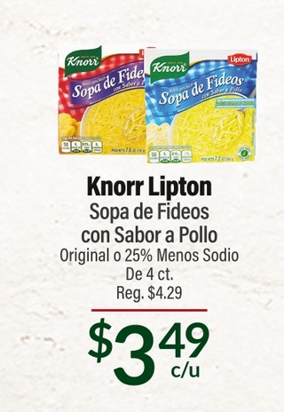 Knorr lipton sopa de fideos con sabor a pollo original o 25% menos soido de 4 ct.