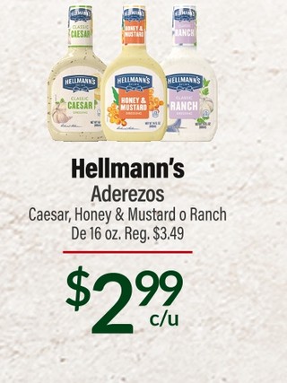 Hellmann´s aderezos caesar, honey y mustard o ranch de 16 oz.