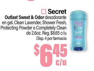 Secret Outlast Sweat & Odor desodorante en gel. Clean Lavender, Shower Fresh, Protecting Powder o Completely Clean de 2.6oz. Reg. $8.65 c/u Disp. 4 por farmacia
