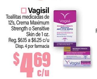 Vagisil Toallitas medicadas de 12's, Crema Maximum Strength o Sensitive Skin de 1 oz.