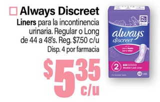 Always Discreet Liners para la incontinencia urinaria. Regular o Long de 44 a 48's.