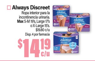 Always Discreet Ropa interior para la incontinencia urinaria. Max S-M 19's, Large 17's o X-Large 15's.