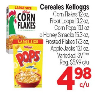 Cereales Kelloggs Corn Flakes 12 oz. Corn Loops 13.2 oz. Corn Pops 13.1 oz o Honey Smacks 15.3 oz, Frosted Flakes 17.3 oz, Apple Jacks 13.1 oz