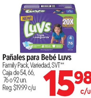 Pañales para Bebé Luvs Family Pack, Variedad, SVT** Caja de 54, 66, 76 ó 92 un.