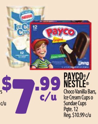 Payco / nestle choco vanilla bars, ice cream cups o sundae cups pqte. 12