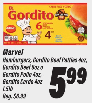 Marvel Hamburgers, Gordito Beef Patties 4oz, Gordito Beef 6oz o Gordito Pollo 4oz, Gordito Cerdo 4oz 1.5lb